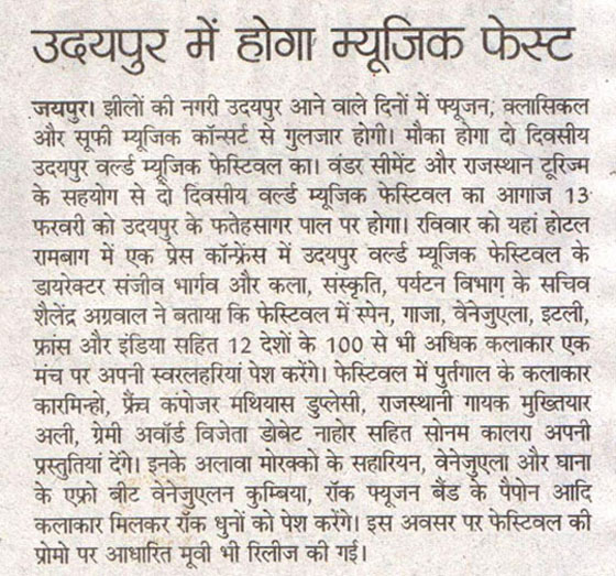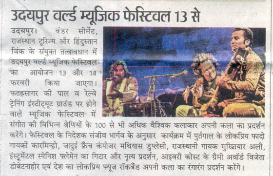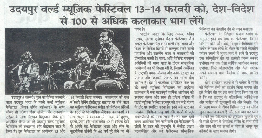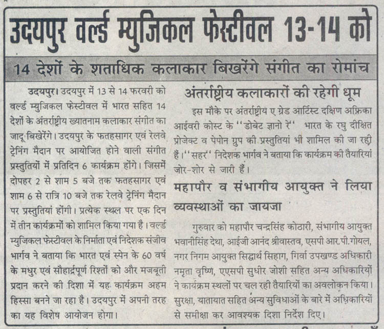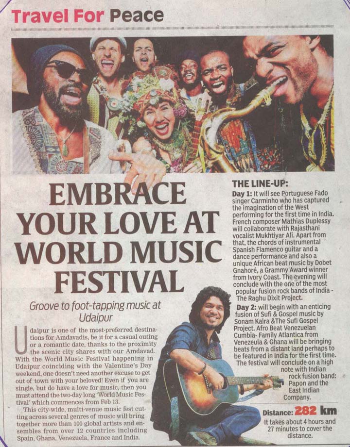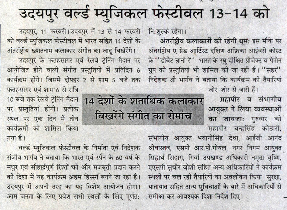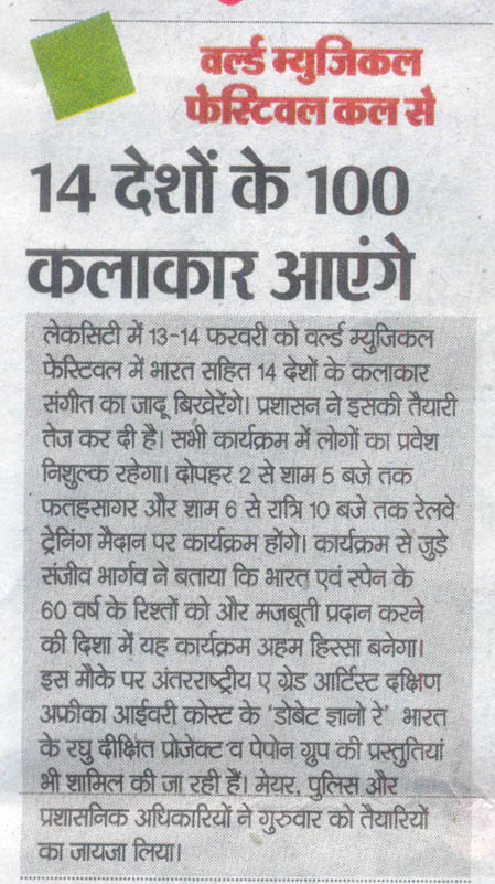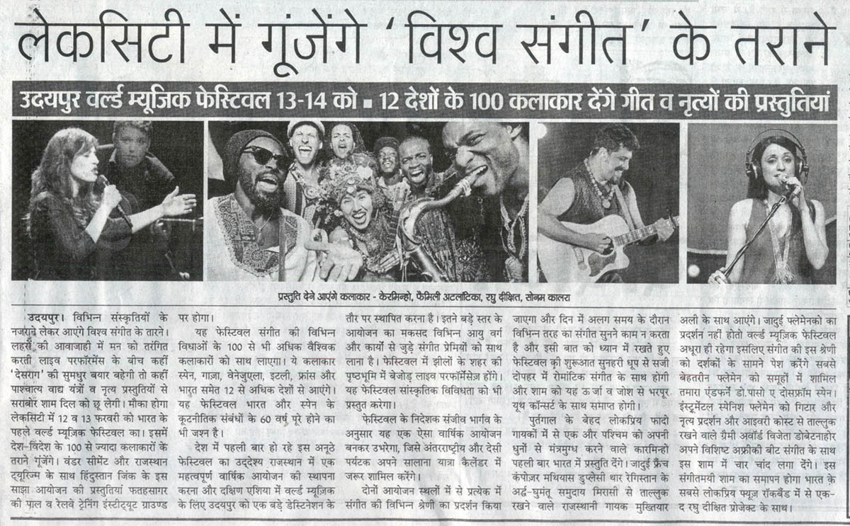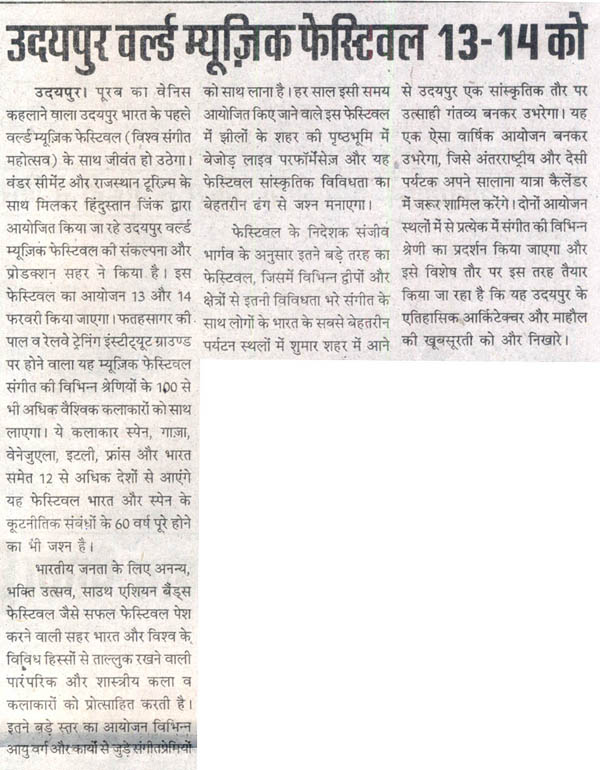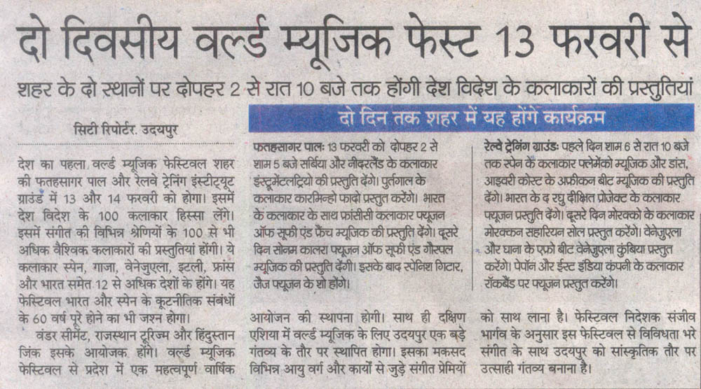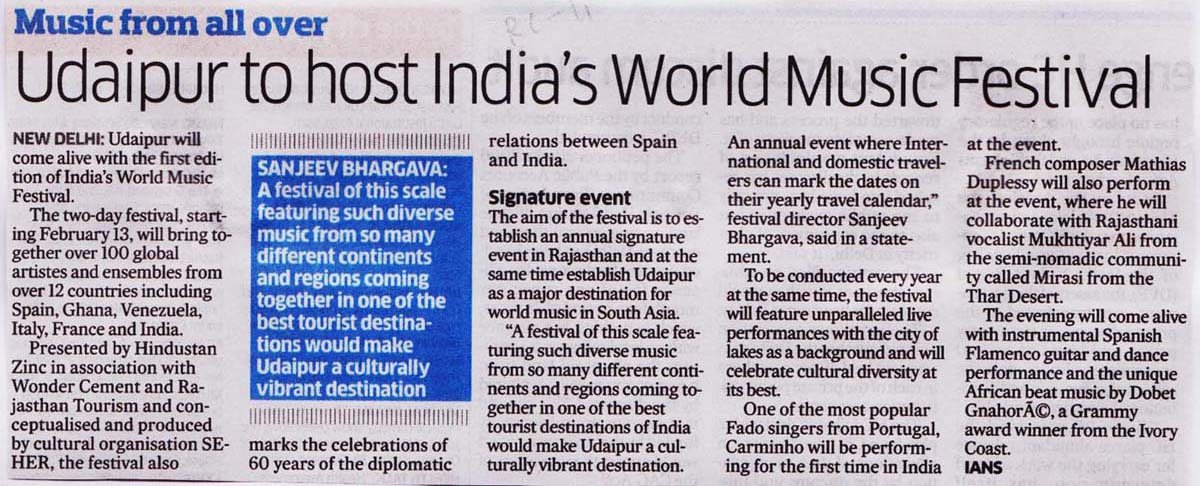 More than 100 musicians from over 12 countries including Spain, Ghana, Venezuela, Italy, France and India and going to assemble in Udaipur as the Southern Rajasthan’s City of Lakes is going to host World Music Festival starting from February 13th. Organized by Hindustan Zinc in association with Wonder Cement and Rajasthan Tourism, the event will be first edition of India’s first World Music Festival.Conceptulatized and produced by cultural organization SEHER, the festival will also mark 60 year old diplomatic relations between Spain and India...........