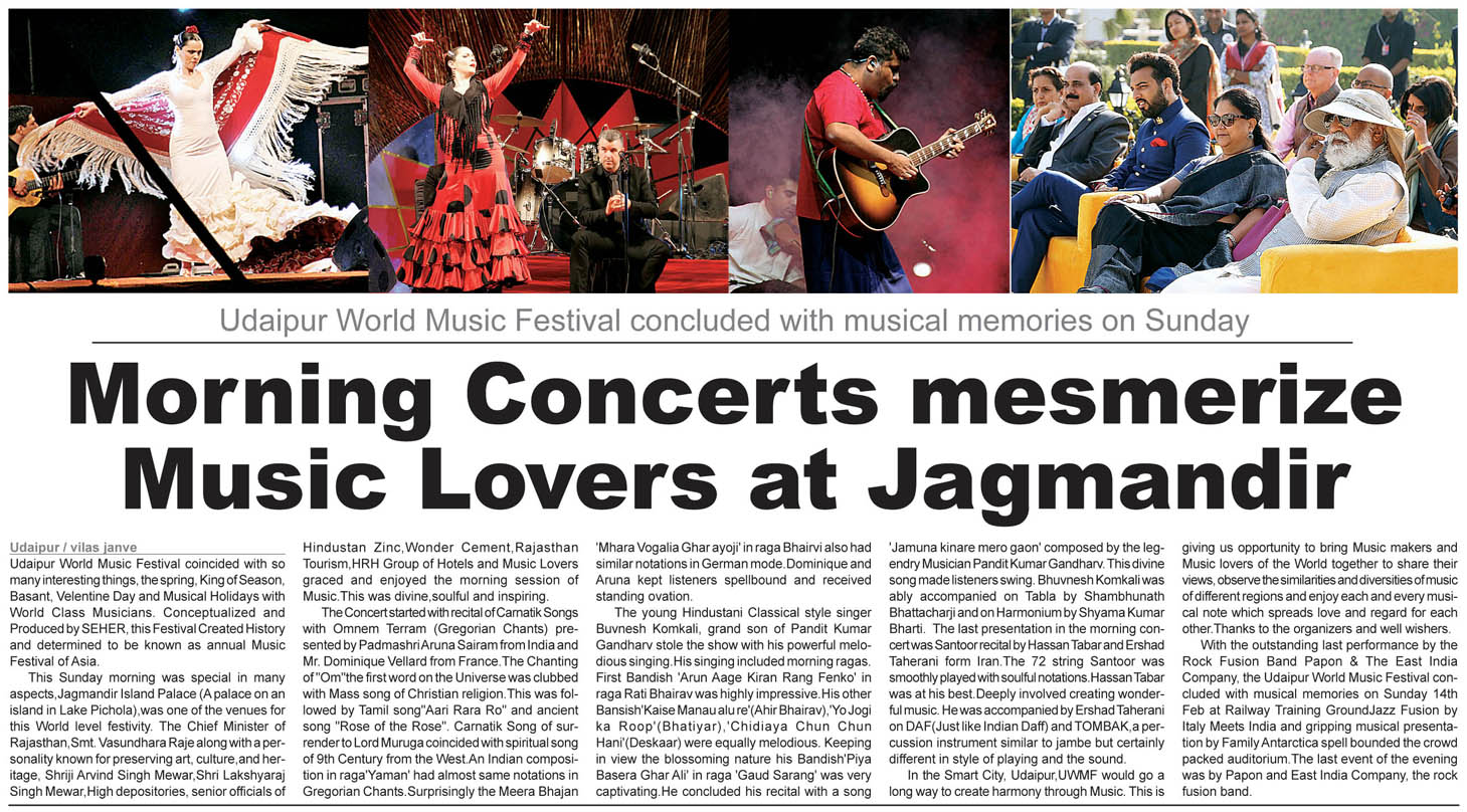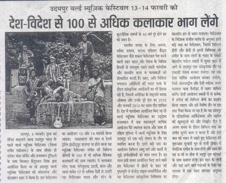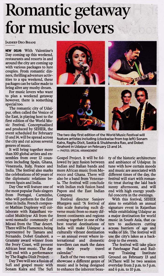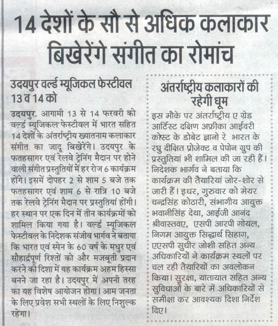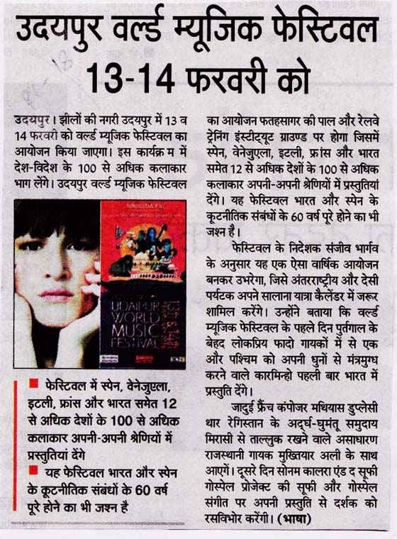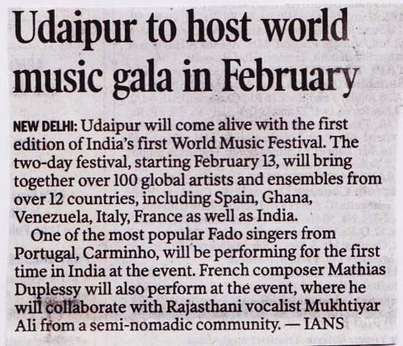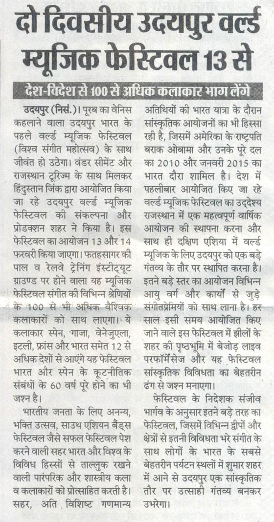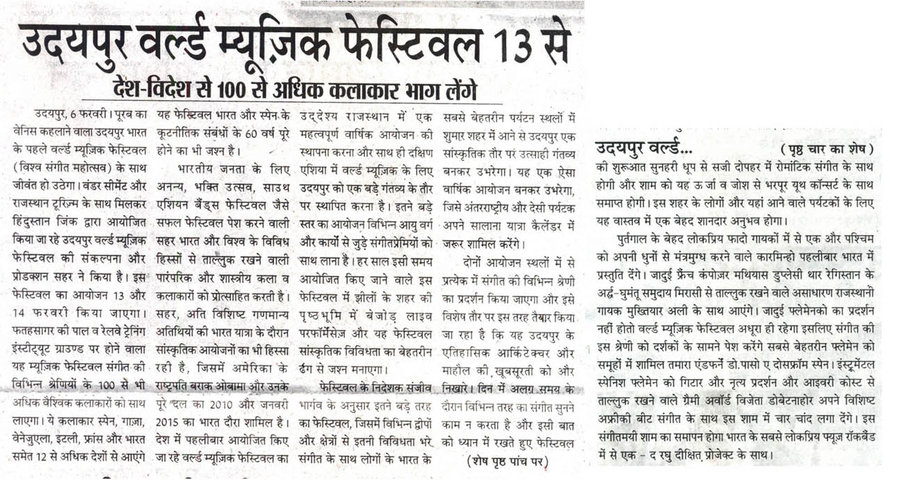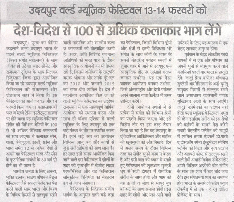 More than 100 musicians from over 12 countries including Spain, Ghana, Venezuela, Italy, France and India and going to assemble in Udaipur as the Southern Rajasthan’s City of Lakes is going to host World Music Festival starting from February 13th. Organized by Hindustan Zinc in association with Wonder Cement and Rajasthan Tourism, the event will be first edition of India’s first World Music Festival.Conceptulatized and produced by cultural organization SEHER, the festival will also mark 60 year old diplomatic relations between Spain and India...........