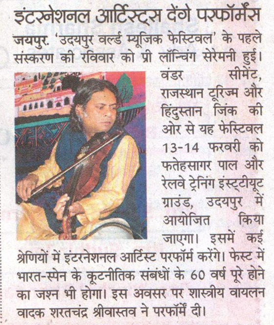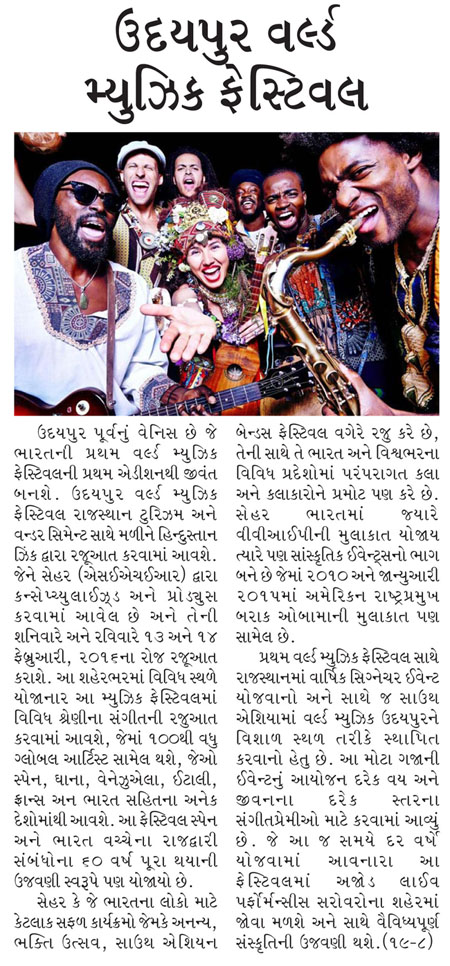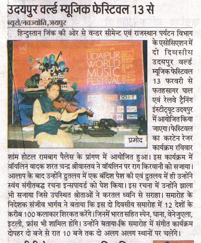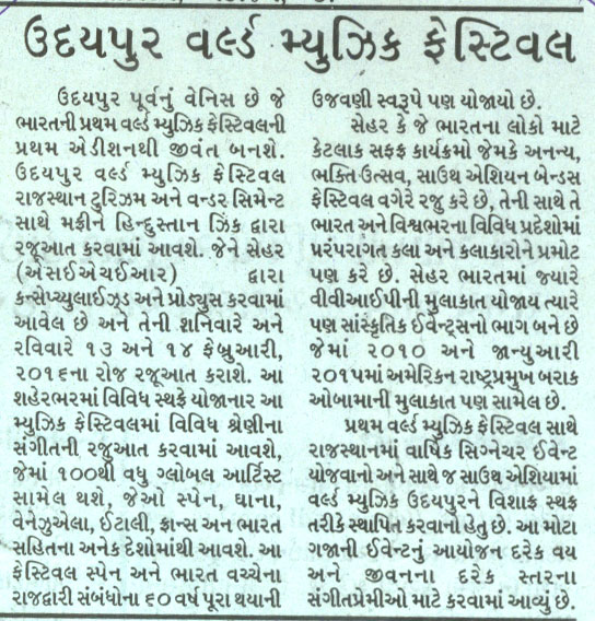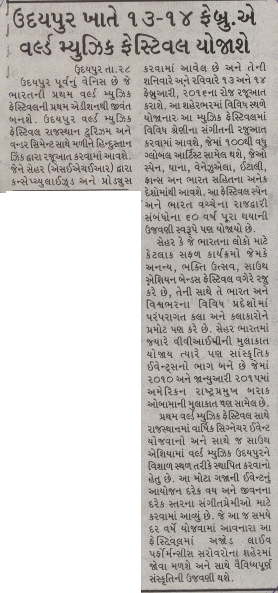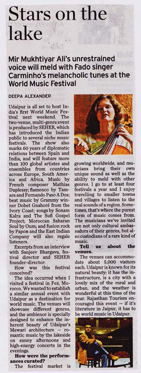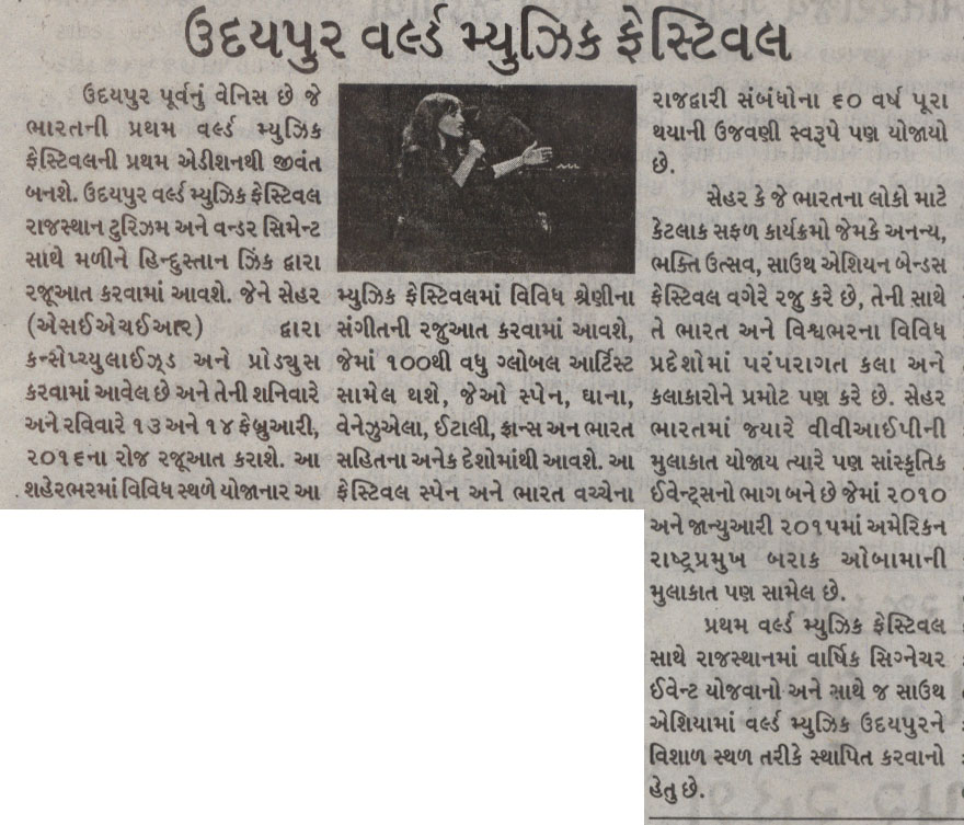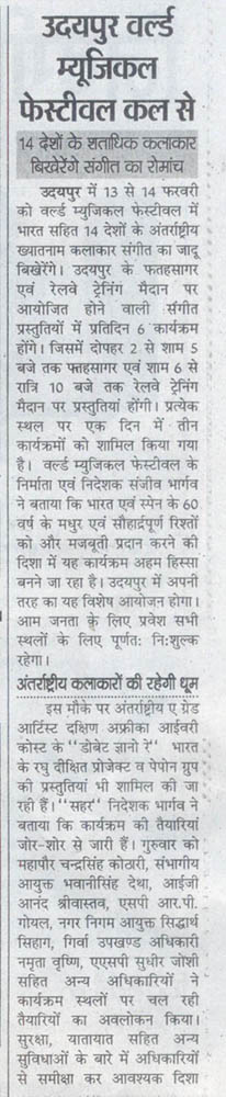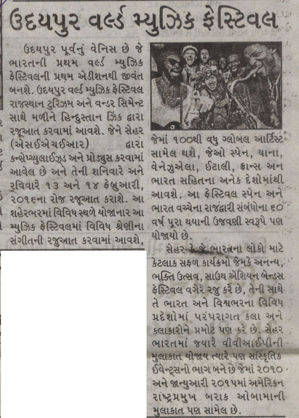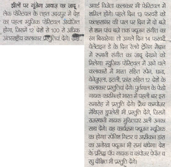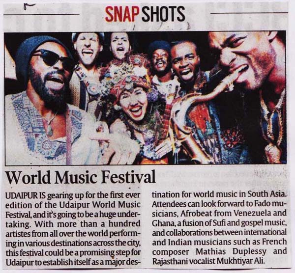 More than 100 musicians from over 12 countries including Spain, Ghana, Venezuela, Italy, France and India and going to assemble in Udaipur as the Southern Rajasthan’s City of Lakes is going to host World Music Festival starting from February 13th. Organized by Hindustan Zinc in association with Wonder Cement and Rajasthan Tourism, the event will be first edition of India’s first World Music Festival.Conceptulatized and produced by cultural organization SEHER, the festival will also mark 60 year old diplomatic relations between Spain and India...........