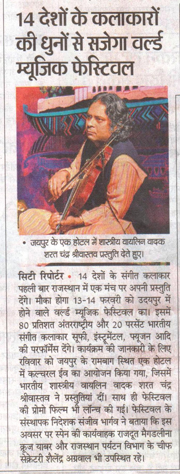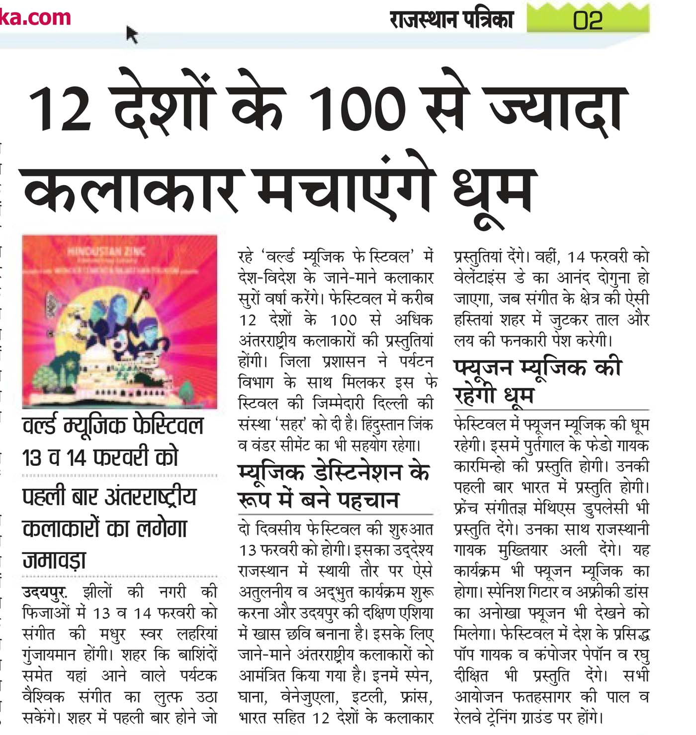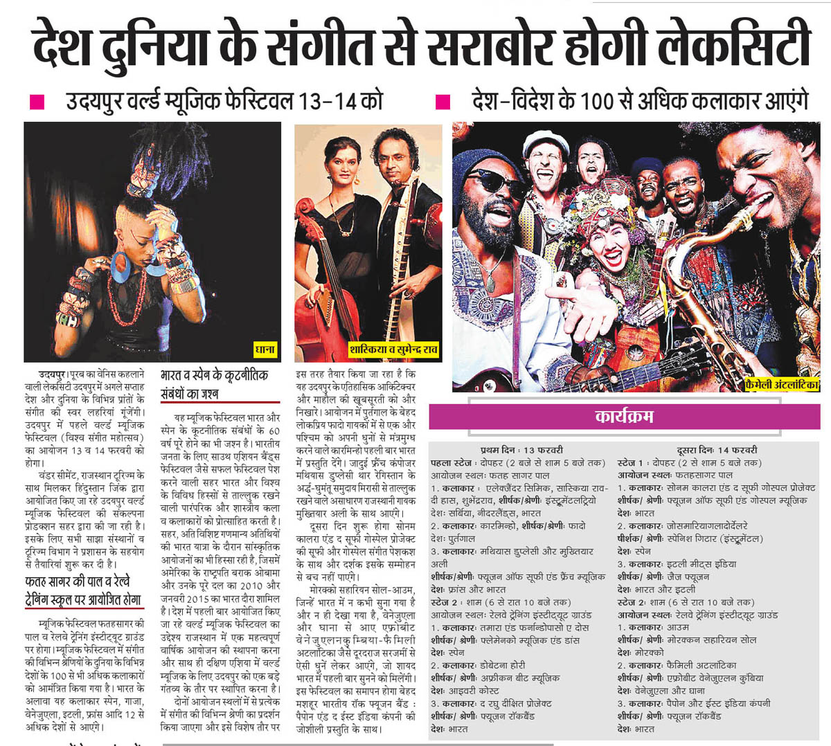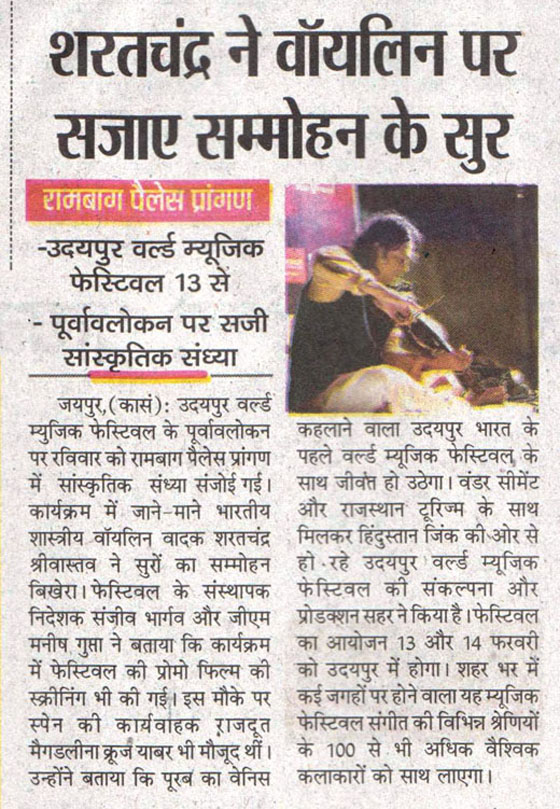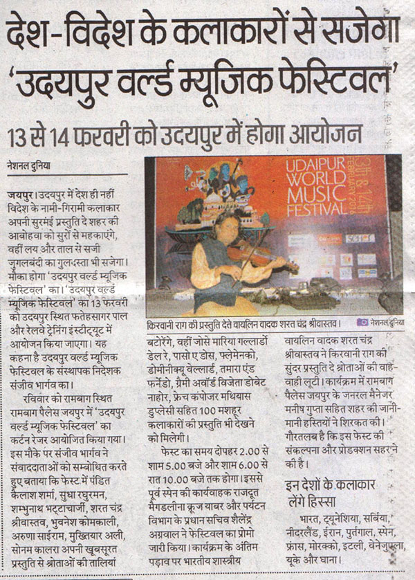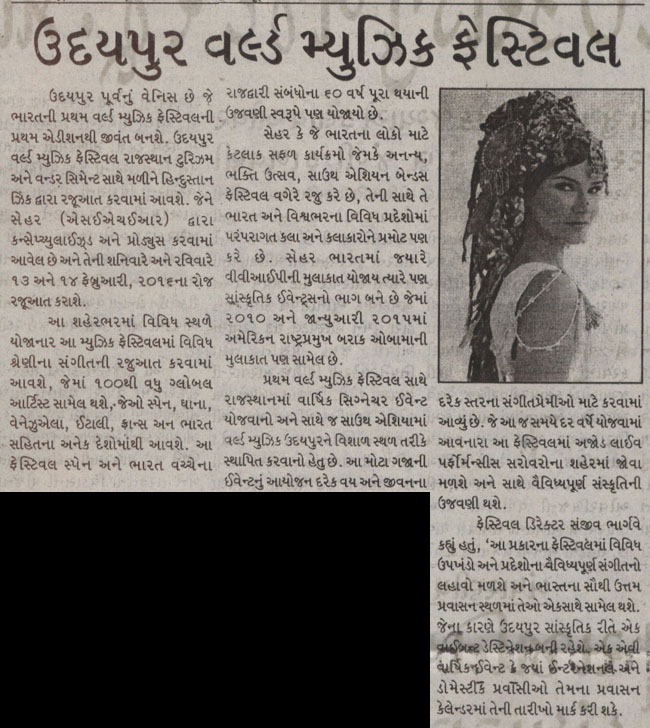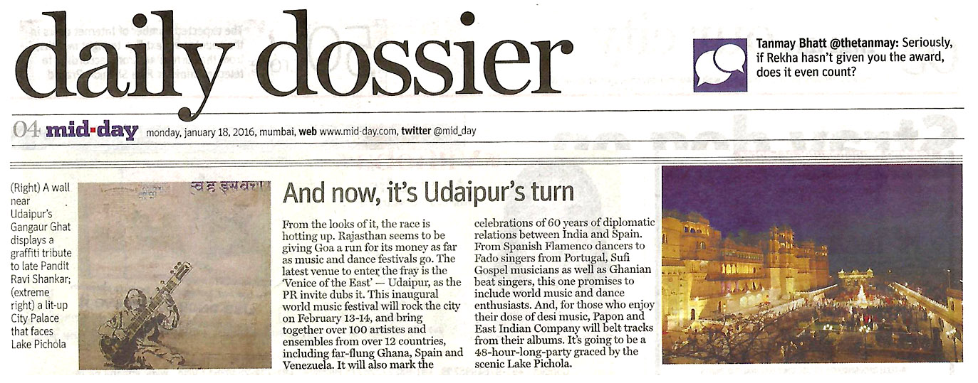More than 100 musicians from over 12 countries including Spain, Ghana, Venezuela, Italy, France and India and going to assemble in Udaipur as the Southern Rajasthan’s City of Lakes is going to host World Music Festival starting from February 13th. Organized by Hindustan Zinc in association with Wonder Cement and Rajasthan Tourism, the event will be first edition of India’s first World Music Festival.Conceptulatized and produced by cultural organization SEHER, the festival will also mark 60 year old diplomatic relations between Spain and India...........