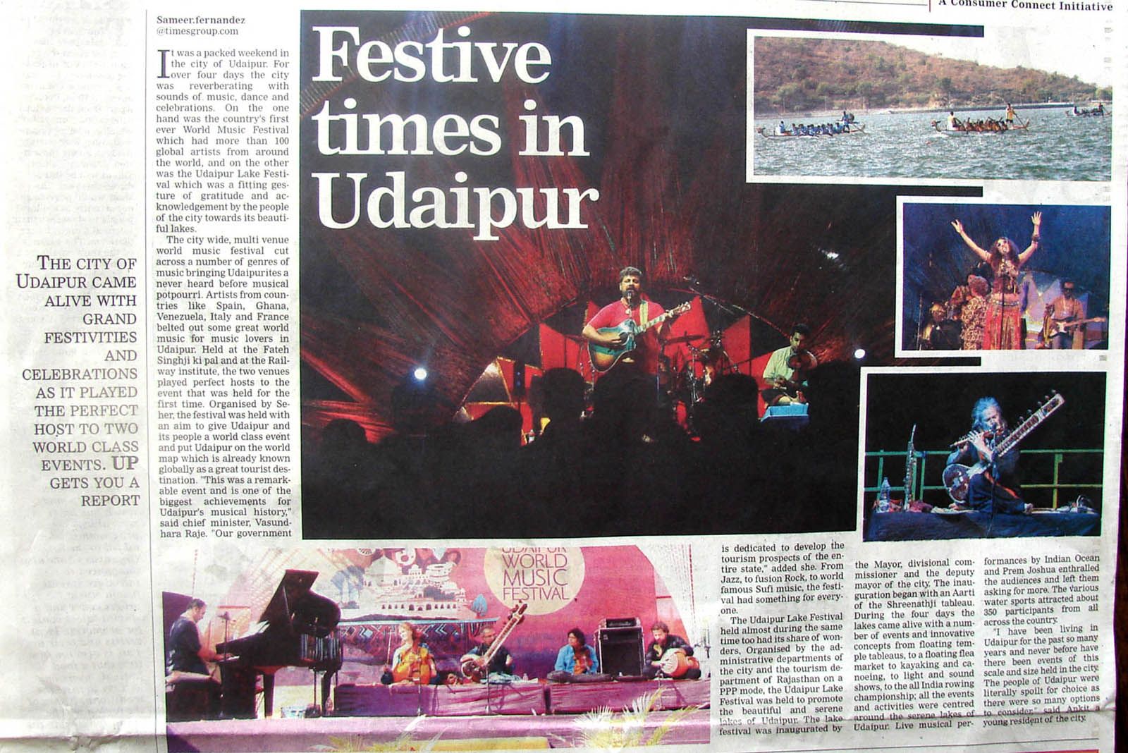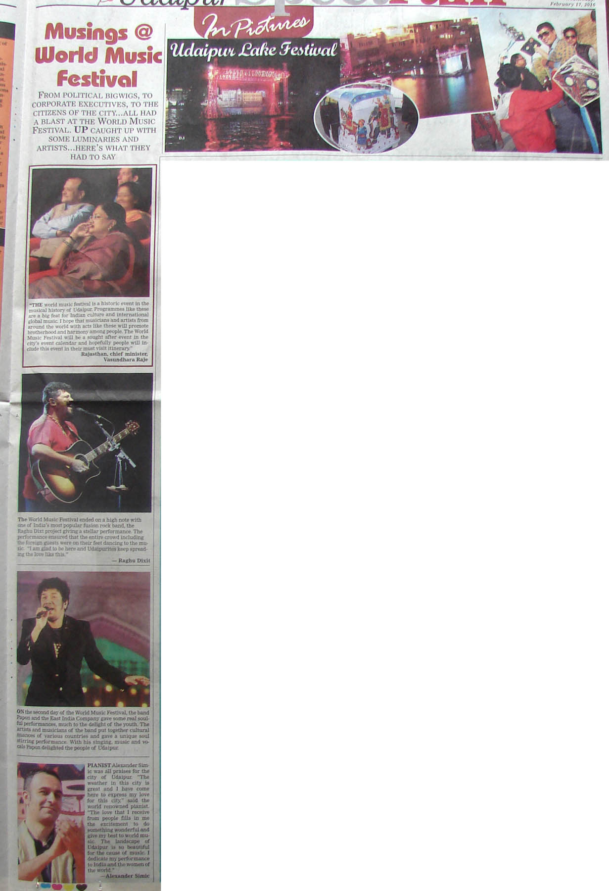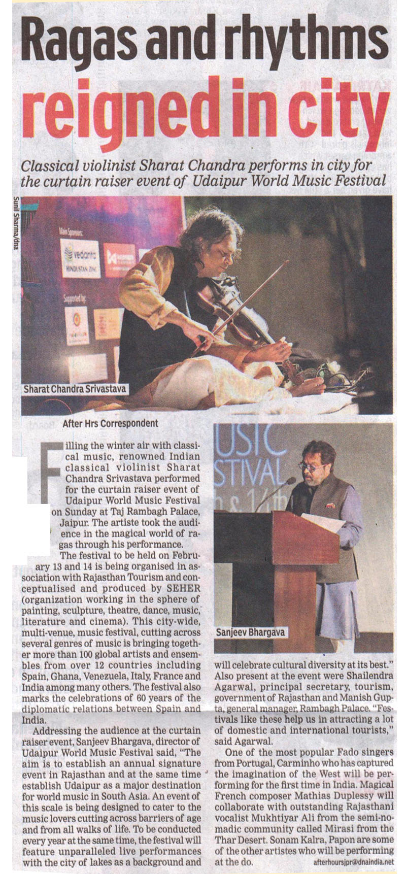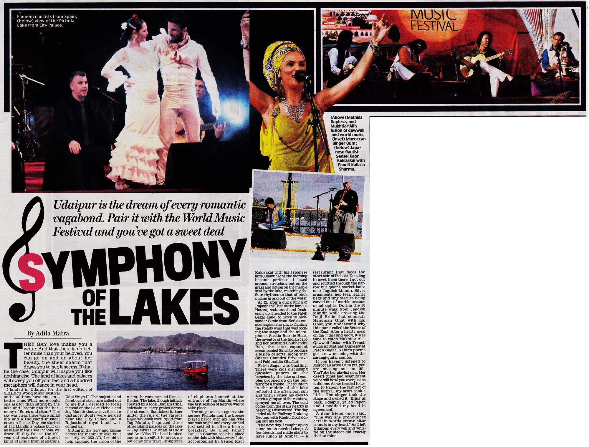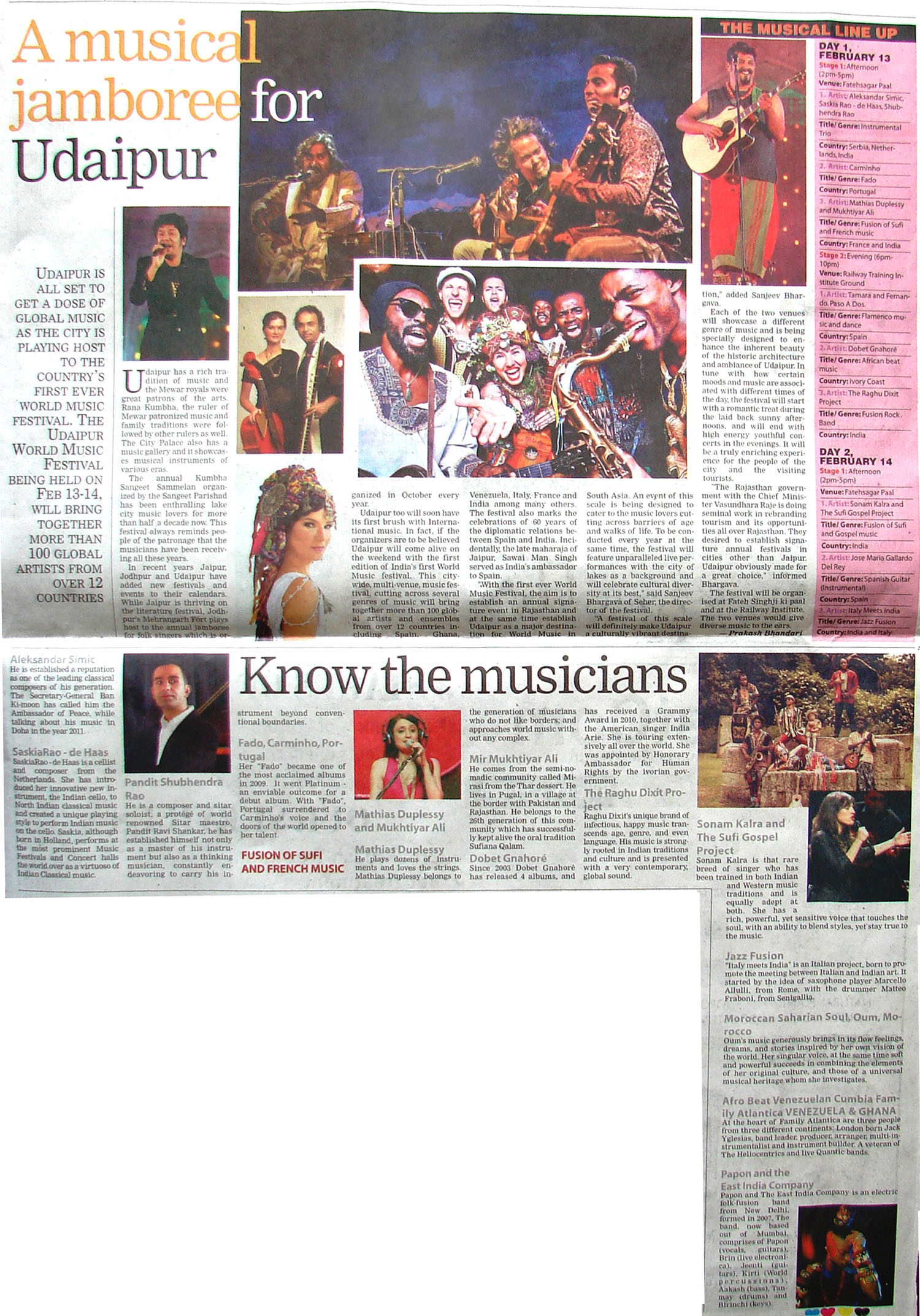 More than 100 musicians from over 12 countries including Spain, Ghana, Venezuela, Italy, France and India and going to assemble in Udaipur as the Southern Rajasthan’s City of Lakes is going to host World Music Festival starting from February 13th. Organized by Hindustan Zinc in association with Wonder Cement and Rajasthan Tourism, the event will be first edition of India’s first World Music Festival.Conceptulatized and produced by cultural organization SEHER, the festival will also mark 60 year old diplomatic relations between Spain and India...........