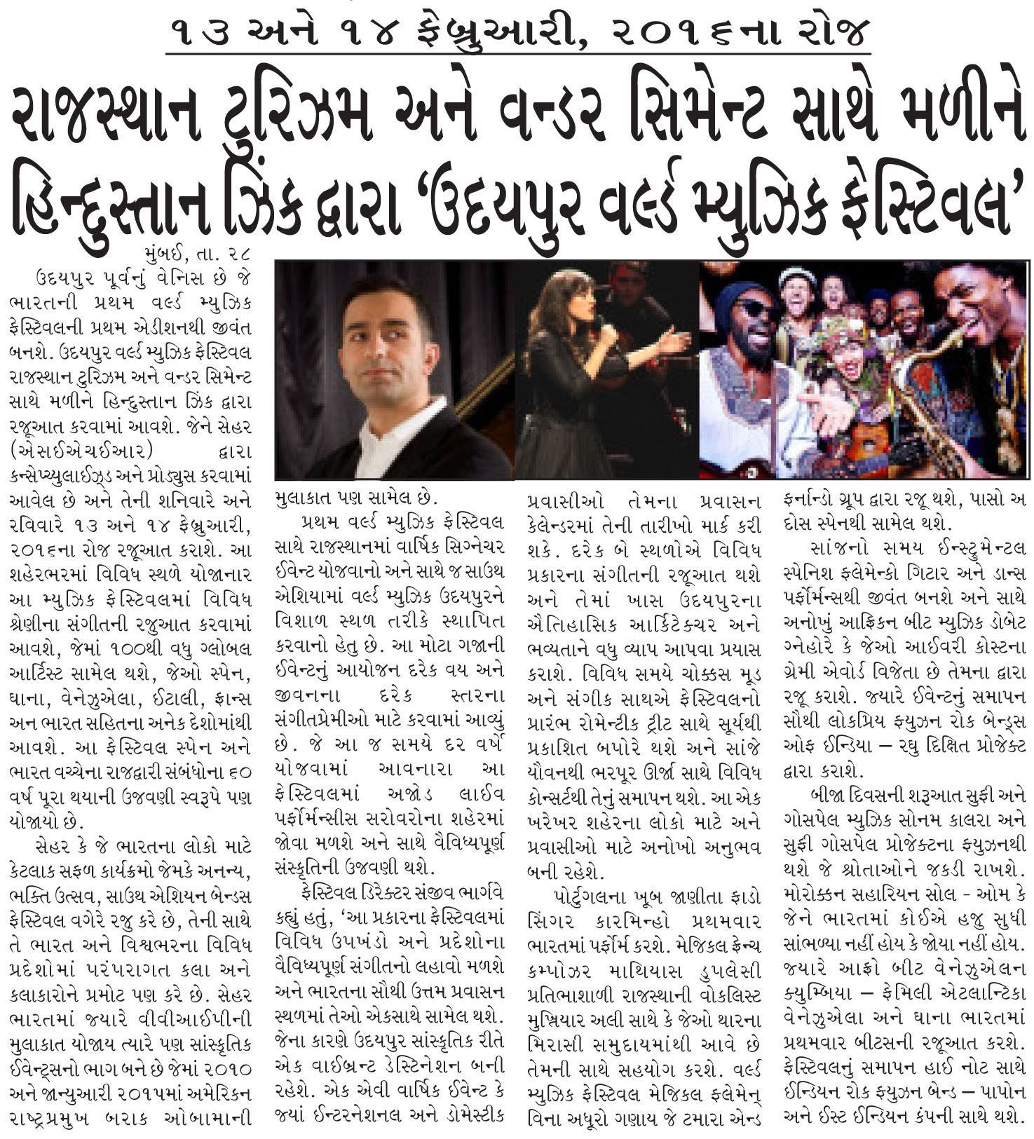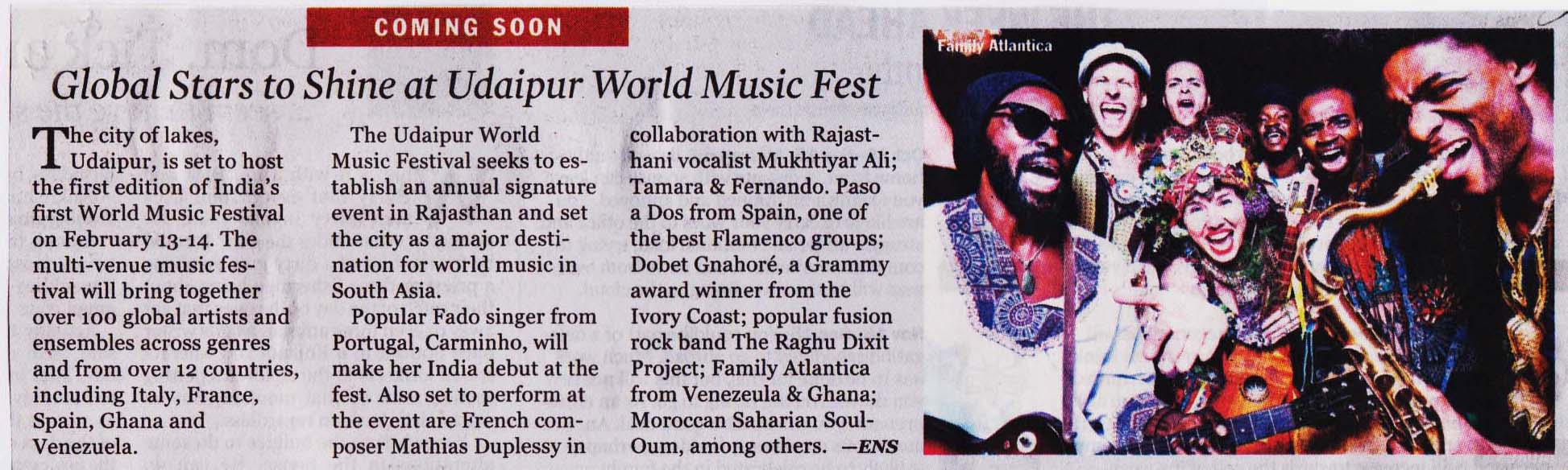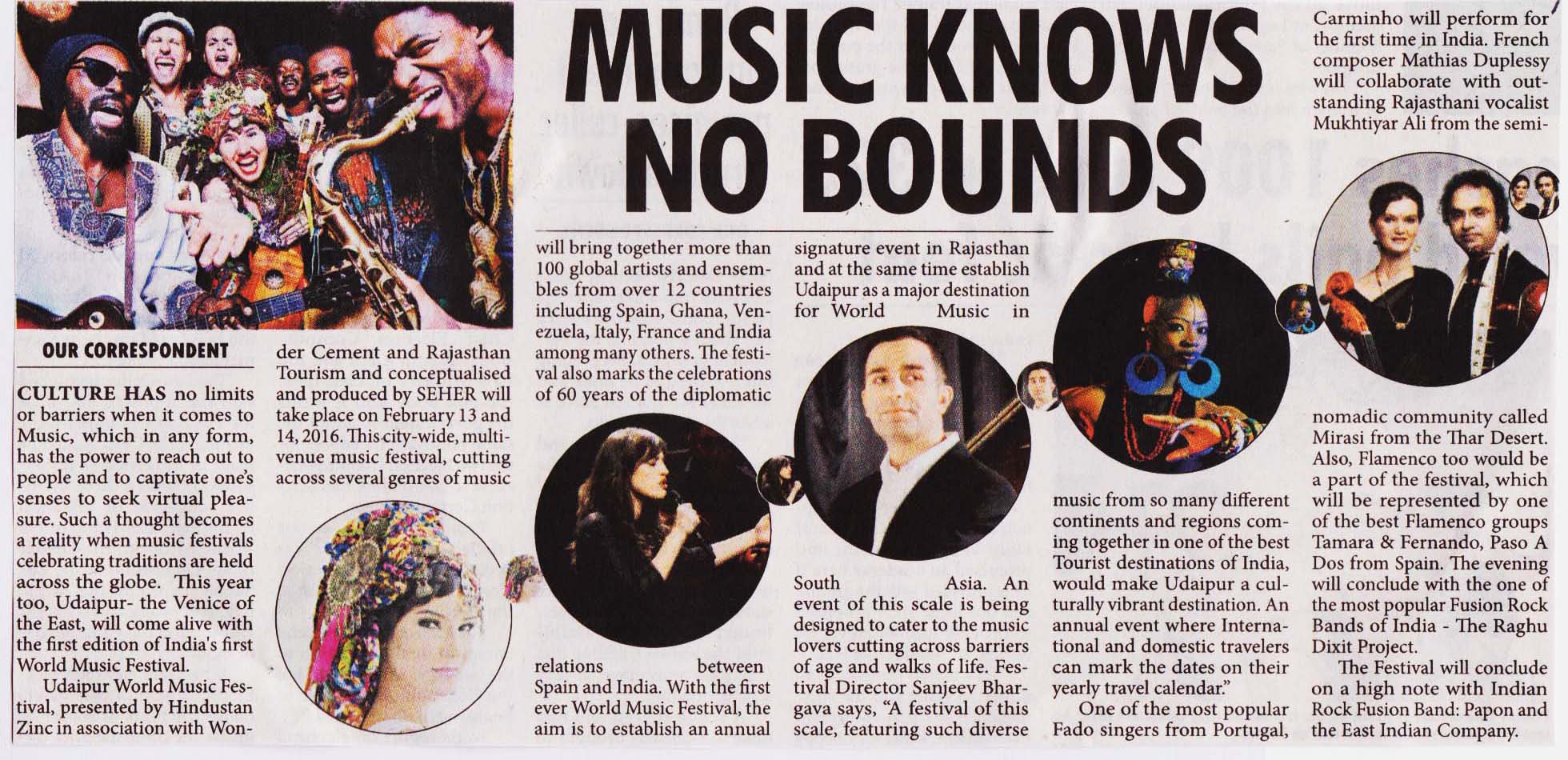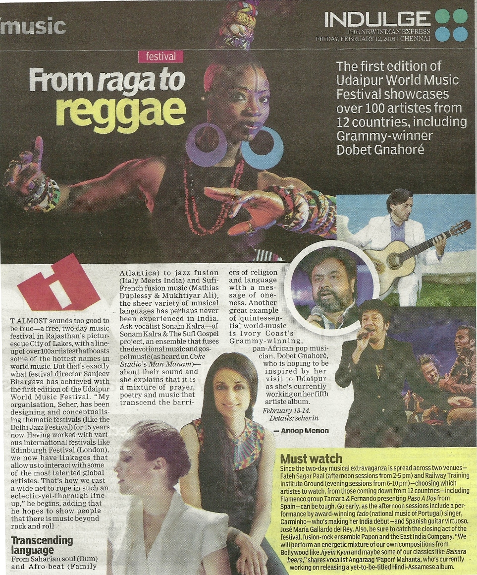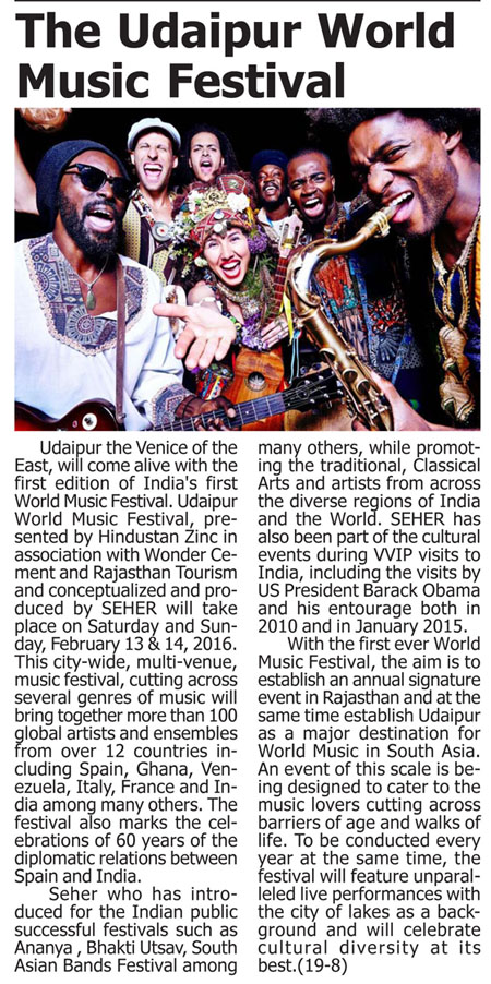Udaipur the Venice of the East, will come alive with the first edition of India's first World Music Festival. Udaipur World Music Festival, presented by Hindustan Zinc in association with Wonder Cement and Rajasthan Tourism and conceptualized and produced by SEHER will take place on Saturday and Sunday, February 13 and 14, 2016. This city-wide, multi-venue, music festival, cutting across several genres of music will bring together more than 100 global artists and ensembles from over 12 countries including Spain, Ghana, Venezuela, Italy, France and India among many others. The festival also marks the celebrations of 60 years of the diplomatic relations between Spain and India...............