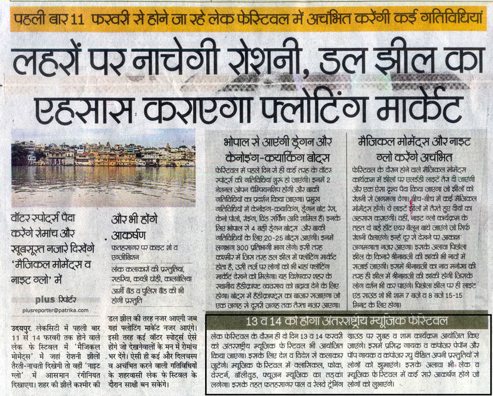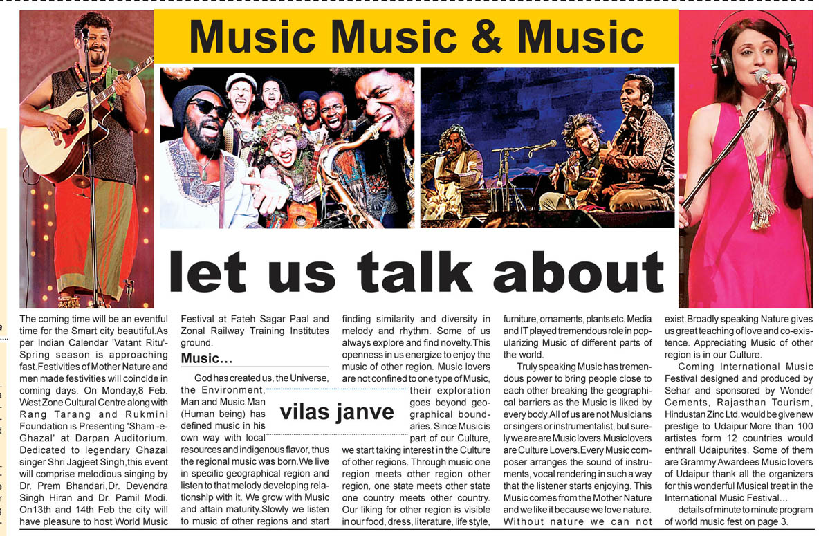 The coming time will be an eventful time for the Smart city beautiful.As per Indian Calendar Vatant Ritu—Spring season is approaching fast.Festivities of Mother Nature and men made festivities will coincide in coming days. On Monday,8 Feb. West Zone Cultural Centre along with Rang Tarang and Rukmini Foundation is Presenting ‘Sham –e- Ghazal’ at Darpan Auditorium.Dedicated to legendary Ghazal singer Shri Jagjeet Singh,this event will comprise melodious singing by Dr. Prem Bhandari,Dr. Devendra Singh Hiran and Dr. Pamil Modi. On13th and 14th Feb the city will have pleasure to host World Music Festival at Fateh Sagar Paal and Zonal Railway Training Institutes ground. Music…let us talk about it...................