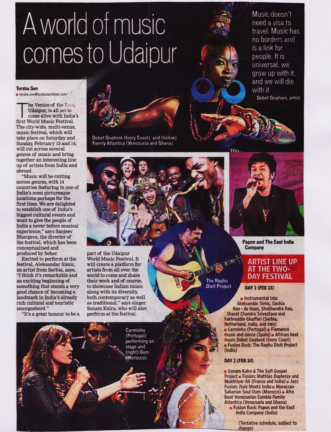 Udaipur will come alive with the first edition of India's first World Music Festival. The two-day festival, starting February 13, will bring together over 100 global artistes and ensembles from over 12 countries including Spain, Ghana, Venezuela, Italy, France and India. Presented by Hindustan Zinc in association with Wonder Cement and Rajasthan Tourism and conceptualised and produced by cultural organisation SEHER, the festival also marks the celebrations of 60 years of the diplomatic relations between Spain and India..........