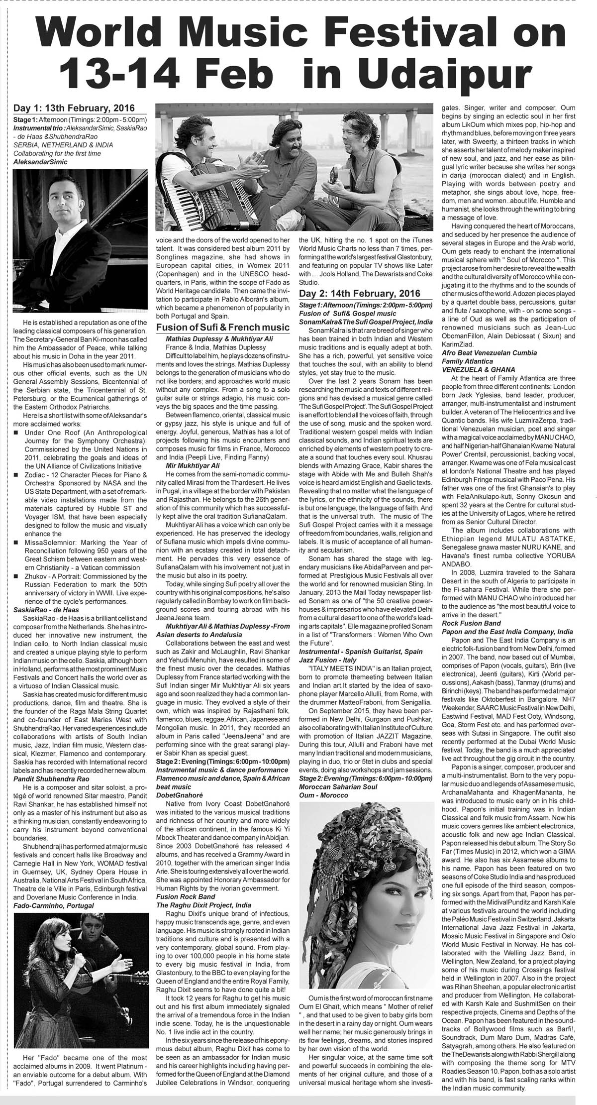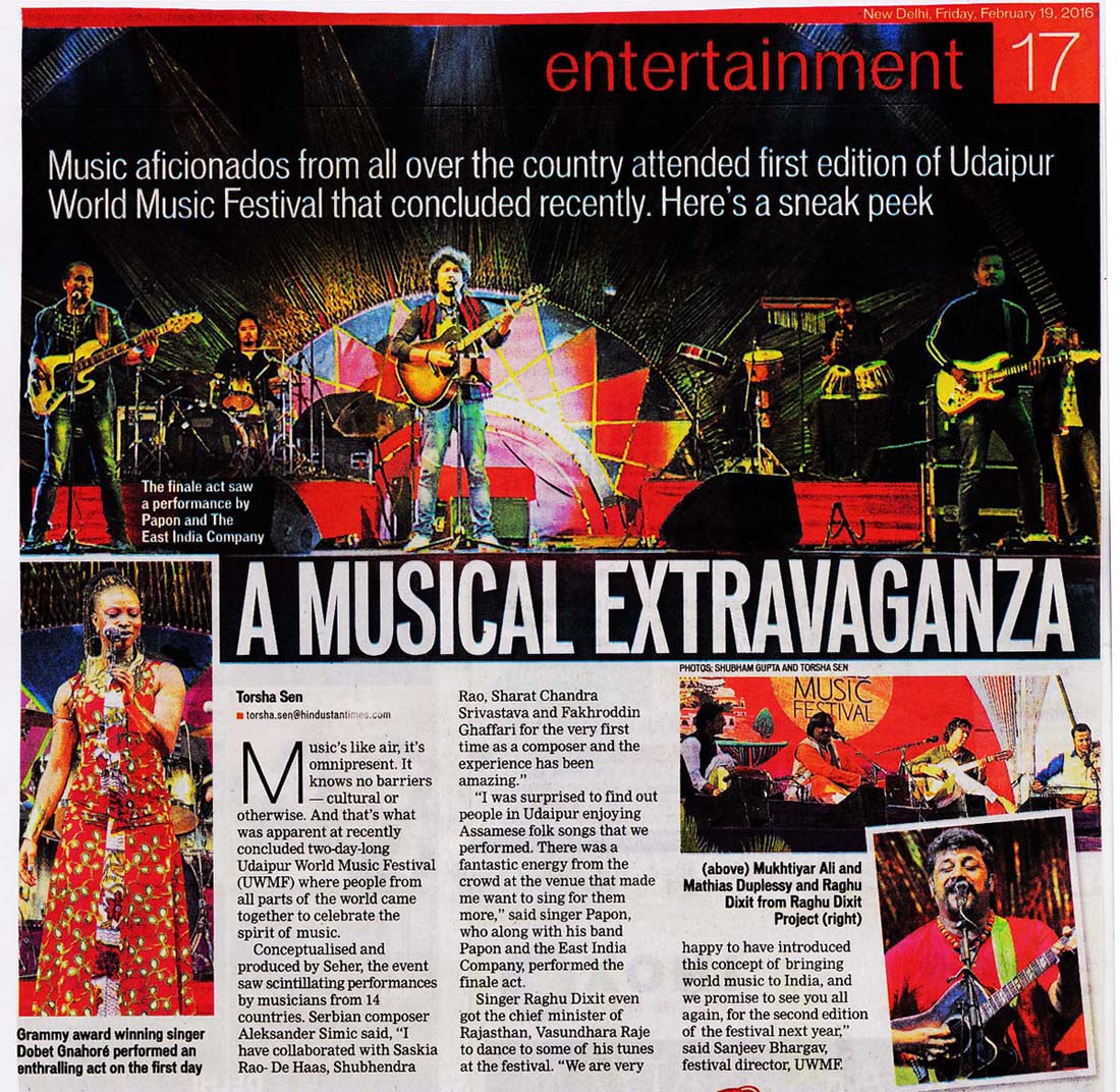 Udaipur the Venice of the East, will come alive with the first edition of India’s first World Music Festival. Udaipur World Music Festival, presented by Hindustan Zinc in association with Wonder Cement and Rajasthan Tourism and conceptualized and produced by SEHER will take place on Saturday and Sunday, February 13 & 14, 2016. This city-wide, multi-venue, music festival, cutting across several genres of music will bring together more than 100 global artists and ensembles from over 12 countries including Spain, Ghana, Venezuela, Italy, France and India among many others. The festival also marks the celebrations of 60 years of the diplomatic relations between Spain and India.............