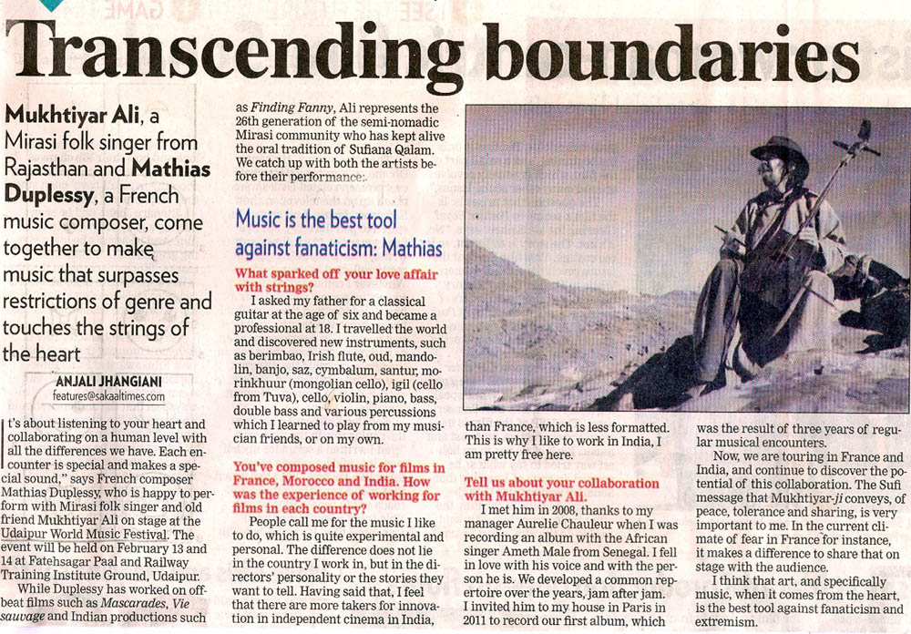 Mathias Duplessy and Mukhtiyar Ali will present a fusion of Sufi and French music at Udaipur World Music Festival. The festival takes place February 13 & 14, 2016 in India. ...................